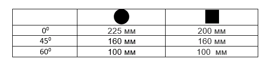 | Діаметр різу прямокутника | 90° - 200x200 мм, 45° - 160x160 мм, 60° - 100x100 мм |